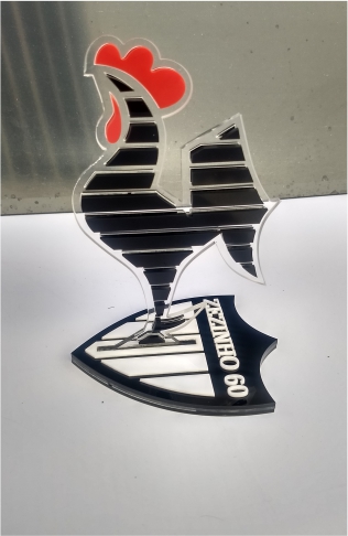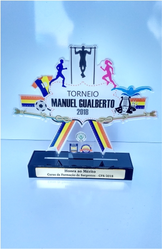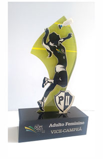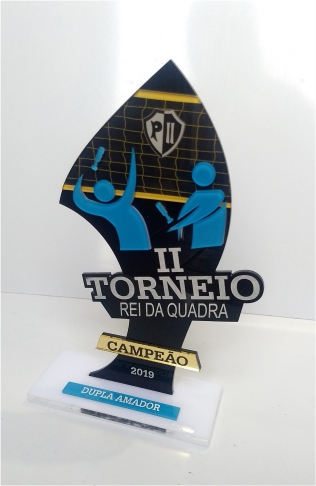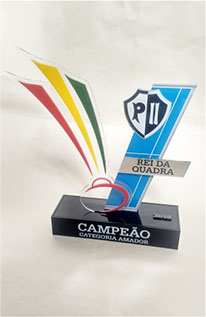 Troféus para Peteca em acrílico, com base caixa. Detalhes impressos e em relevo.