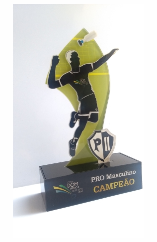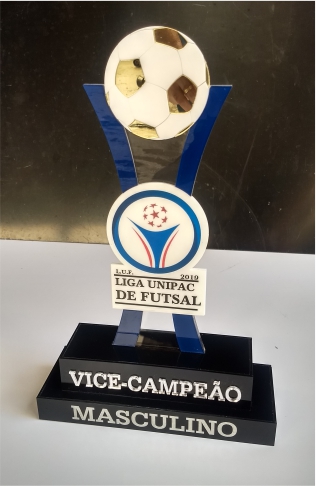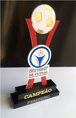 Troféu Futsal em acrílico com detalhes em relevo e impressos.