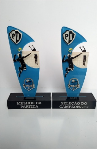 Troféus para Vôlei em acrílico, com base caixa. Detalhes impressos e em relevo.