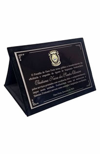 Placa de Homenagem em ACM Preto com gravação a laser e símbolo em relevo. Capa de Veludo.