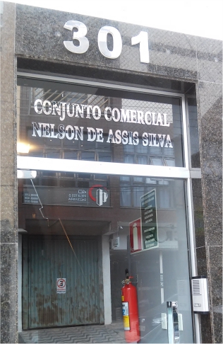 Placa Edifício em ACM preto com letras em relevo.