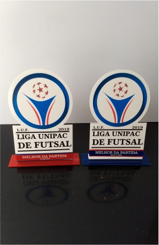 Troféu Futsal em acrílico com detalhes em relevo e impressos.