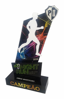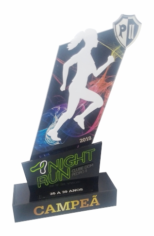 Troféus para Corrida em acrílico, com base caixa. Detalhes impressos e em relevo.