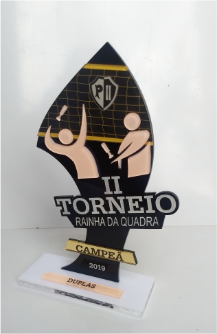 Troféus para Peteca em acrílico, com base caixa. Detalhes impressos e em relevo.