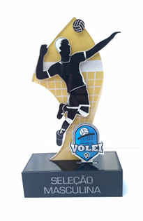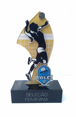 Troféus para Voleibol em acrílico, com base caixa. Detalhes impressos e em relevo.