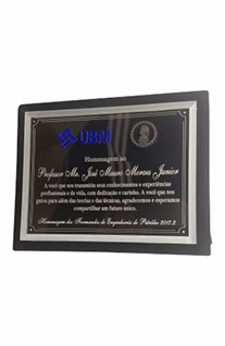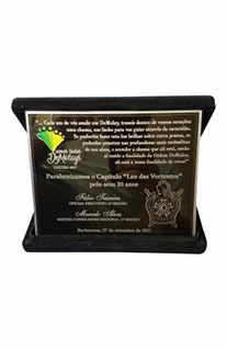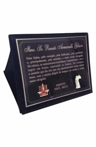 Placa de Homenagem em ACM Preto com gravação a laser e símbolo em relevo. Estojo de Veludo.
