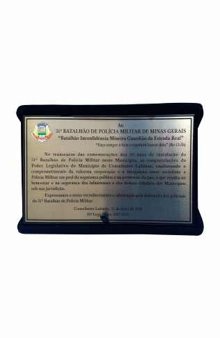 Placa de Homenagem em ACM Prata com gravação a laser e símbolo em relevo. Estojo de Veludo.