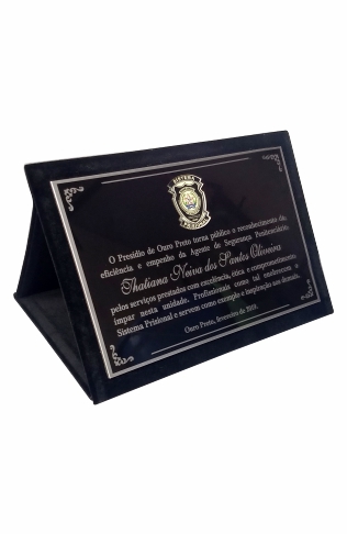 Placa de Homenagem em ACM Preto com gravação a laser e símbolo em relevo. Capa de Veludo.