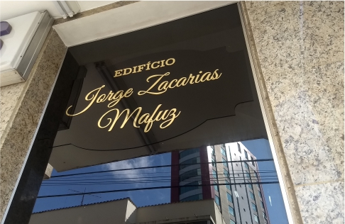 Placa para Edifício em Acrílico com detalhes dourados em relevo.